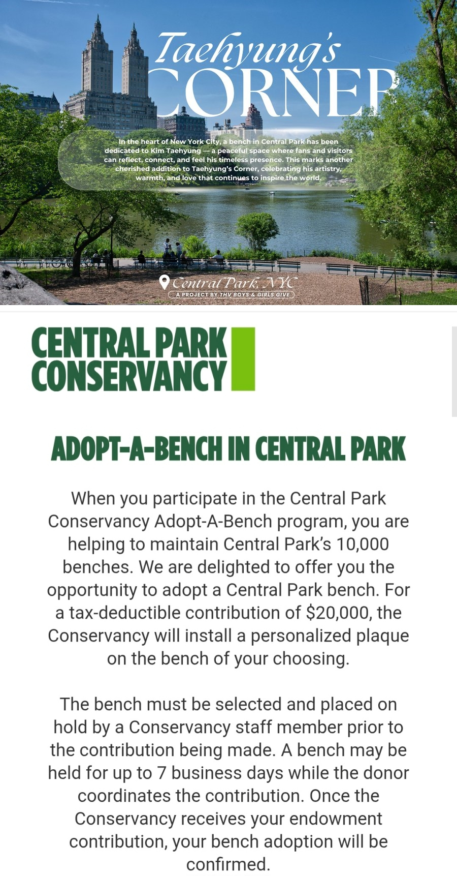 센트럴파크는 맨해튼에 있는 뉴욕 중심부에 있는 공원으로, 해마다 2500만 명의 관광객이 찾고 있으며 미국 전역을 통틀어 가장 많은 사람이 찾는 공원으로 꼽힌다. 뷔의 벤치는 지난 5월 새로 조성된 데이비스 센터가 있는 인공호수가에 위치해 있으며 호수의 경치를 즐길 수 있다.