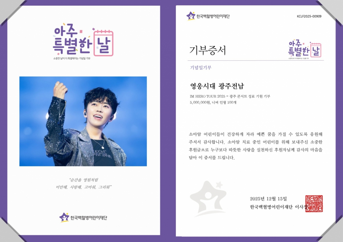 이번 기부는 오는 2025년 12월 19일 개최될 예정인 '임영웅 IM HERO TOUR 2025 - 광주' 콘서트 성공 개최를 기념해 마련된 나눔이다. 전달된 후원금은 광주·전남 지역 소아암 환아의 치료비로 전액 사용될 예정이다. 팬들이 참여한 니버 인형 만들기 캠페인을 통해 제작된 인형은 소아암 어린이들의 친구가 되어줄 것으로 보인다.