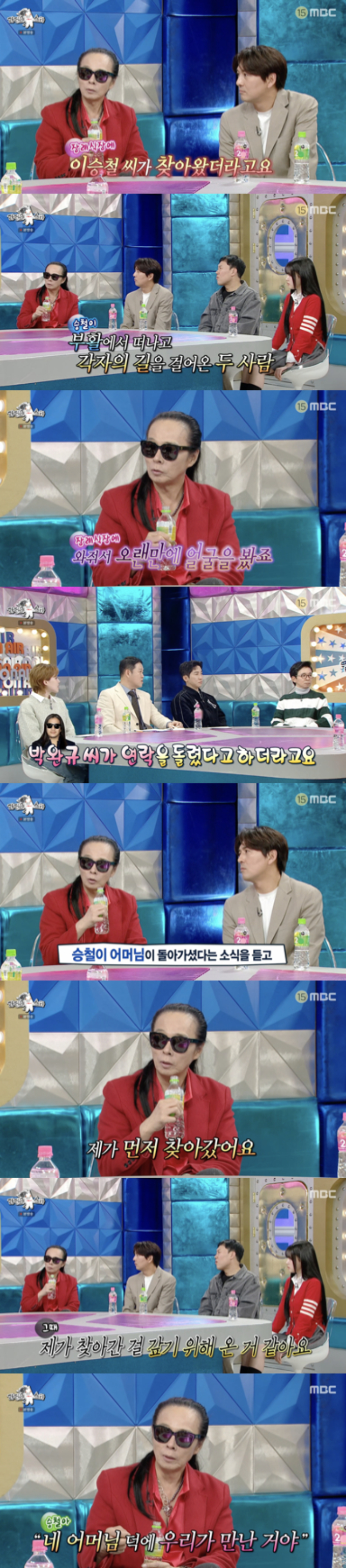 이어 그는 당시 이승철이 건넨 말을 전했다. 김태원은 "(이승철이) 친했는데 매듭을 풀지 못하고…"라며 "장례식장에서 꽤 오랜만에 얼굴을 봤다"라고 회상했다.이에 김구라는 상황을 덧붙였다. 그는 "박완규 씨가 연락을 돌렸다고 하더라"라며, 후배 박완규의 연락을 계기로 이승철이 김태원을 찾아오게 됐다고 설명했다.