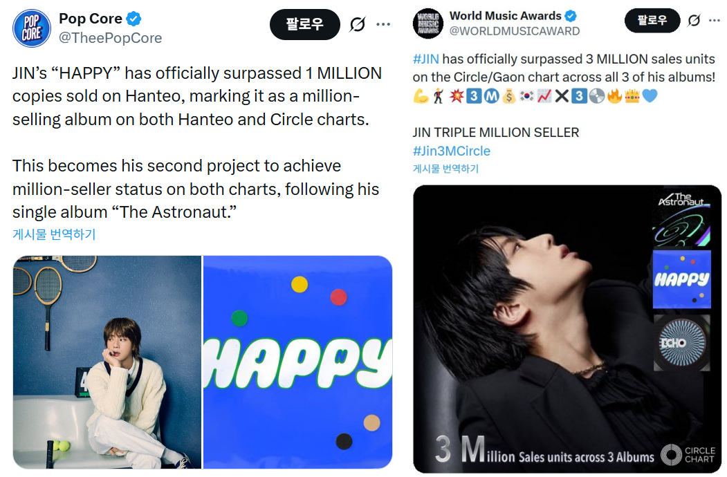 방탄소년단(BTS) 진의 첫 번째 미니앨범 'HAPPY(해피)'가 한터차트와 써클차트에서 각각 100만장 판매를 돌파하며 더블 밀리언셀러의 위업을 달성했다. 특히 써클차트에서는 누적 300만장을 넘어서며 진의 막강한 앨범 판매력을 다시 한번 입증했다. 본격적인 솔로 활동을 재개한 진의 행보가 글로벌 팬덤을 넘어 음반 시장까지 흔들고 있다.