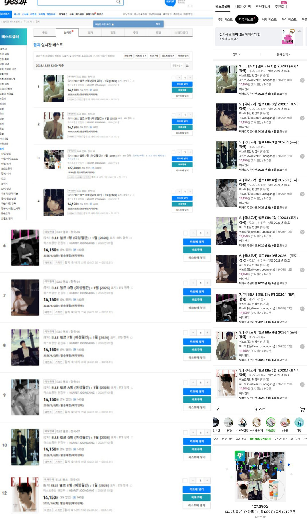 방탄소년단(BTS) 정국이 커버한 잡지가 베스트셀러 1위를 휩쓸며 초특급 인기와 파급력을 보여줬다. 지난 15일 오전 정국이 장식한 패션 매거진 엘르의 2026년 1월호 9종 커버가 공개되며 폭발적인 반응이 나타났다.