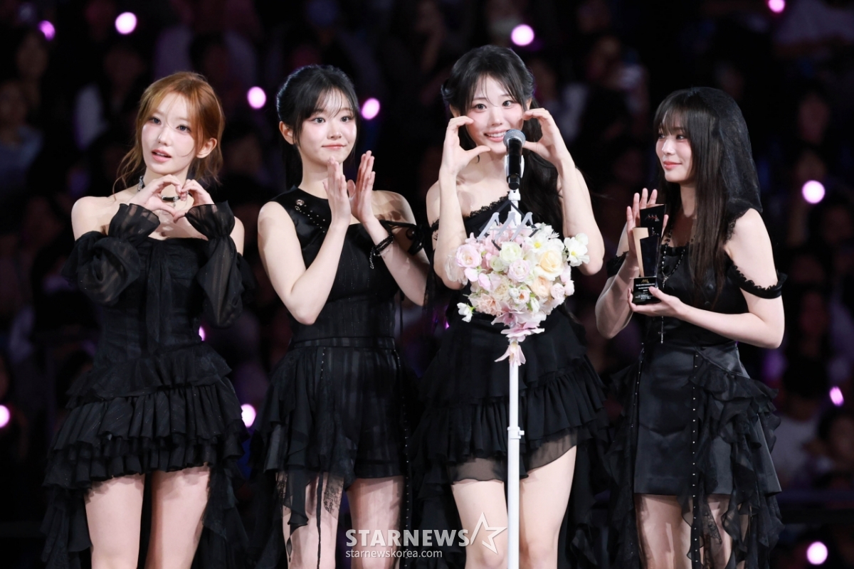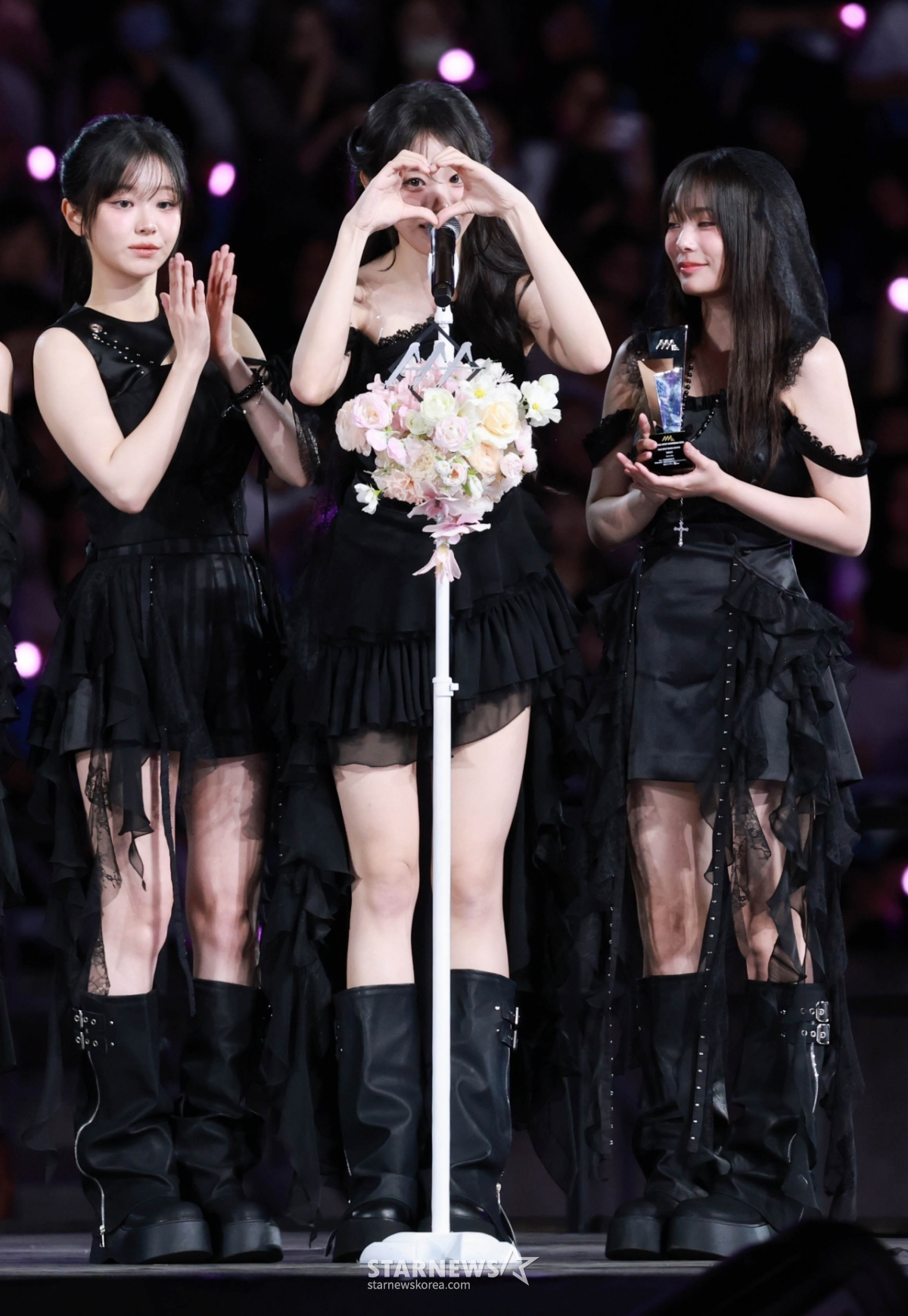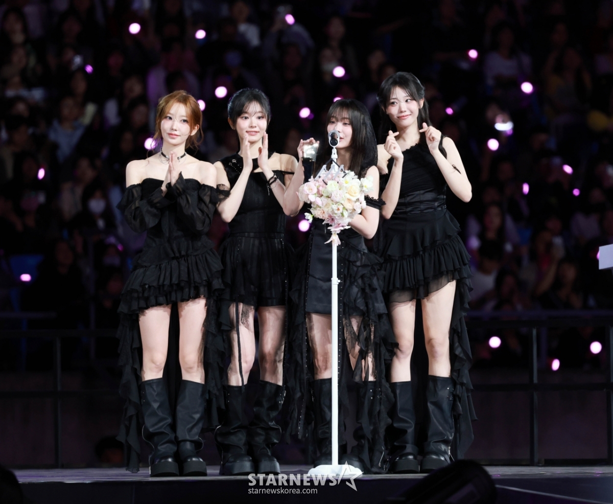 그룹 큐더블유이알(QWER)이 6일 대만 가오슝 내셔널 스타디움에서 진행된 스타뉴스 주최 '10주년 아시아 아티스트 어워즈 2025(10th Anniversary Asia Artist Awards 2025, '10주년 AAA 2025')에서 AAA Best Band상을 받고 수상소감을 말하고 있다.