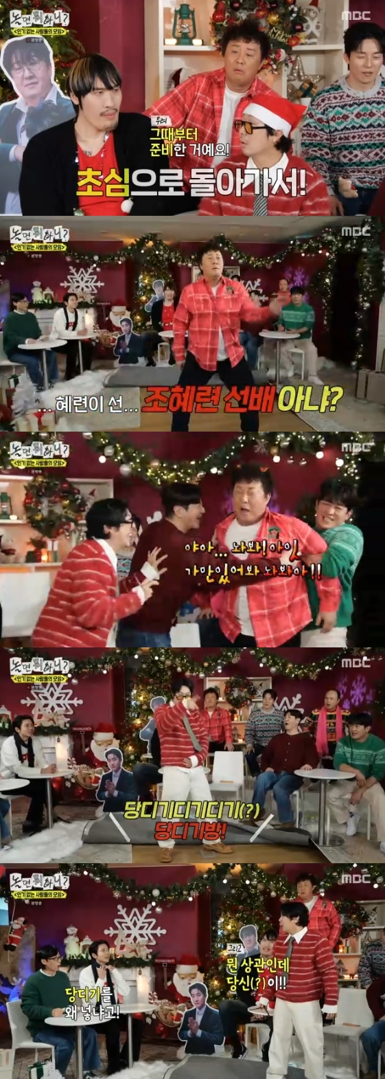 먼저 무대에 나선 정준하는 자신의 이름을 가사에 포함하며 정체 모를 춤사위를 선보여 멤버들의 빈축을 샀다. 이를 본 유재석은 "이게 뭐 하는 거냐"라고 쓴소리를 던졌고, 멤버들 역시 "조혜련 아니냐"며 비아냥댔다. 하하는 "됐다. 괜찮다"라고 경계심을 풀어 웃음을 자아냈다. 이어진 무대에서 하하는 남다른 춤 실력을 드러내는가 싶더니 자신의 곡인 '당디기 방'을 삽입해 맹비난받았다. 유재석은 "잠깐만!"을 외치며 노래를 끊었고, "당디기방을 왜 넣냐. 순수하지 않다"라고 비난했다.