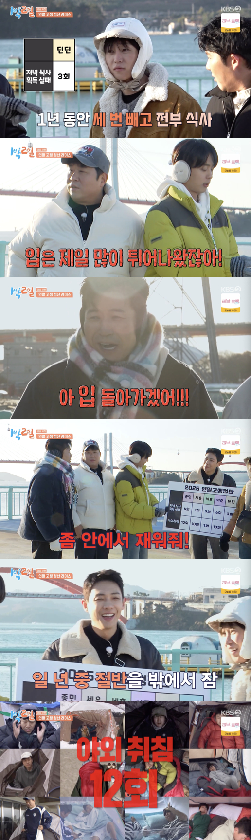 이날 방송에서는 1년간 멤버들이 저녁 식사를 하지 못한 횟수와 야외 취침 횟수를 연말정산 형식으로 공개됐다. 저녁 식사를 거른 횟수는 김종민 6번, 문세윤 7번, 조세호 5번, 이준 6번, 딘딘 3번, 유선호 7번으로 집계됐다.
