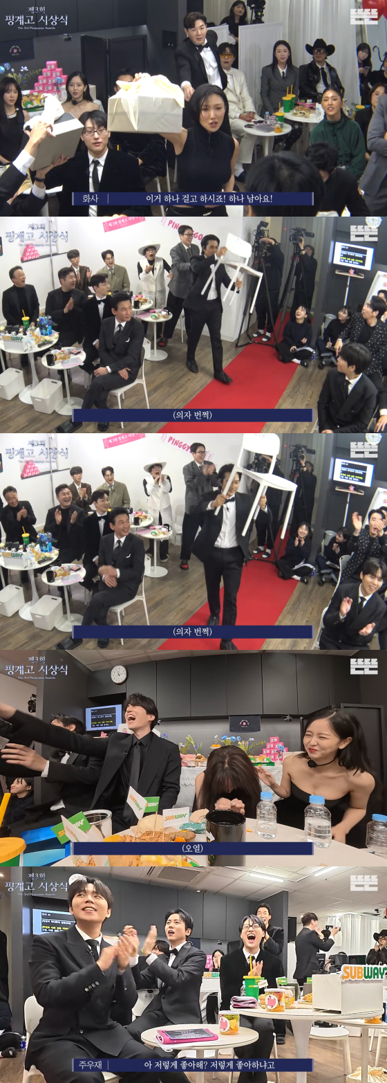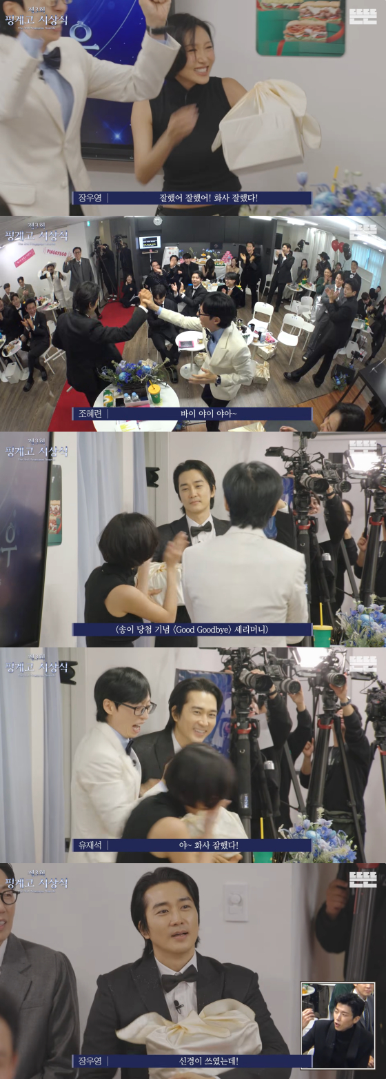 배우 송승헌이 뜻밖의 럭키드로우 행운에 환호했다.유튜브 채널 뜬뜬에는 21일 '제3회 핑계고 시상식' 영상이 게재됐다.