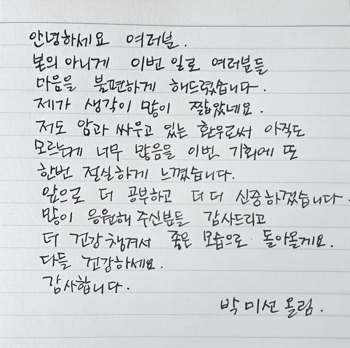 그는 "제가 생각이 많이 짧았다. 저도 암과 싸우고 있는 환우로서, 아직도 모르는 게 너무 많음을 이번 기회에 또 한 번 절실하게 느꼈다. 앞으로 더 공부하고 더 더 신중하겠다"라며 "많이 응원해 주신 분들 감사드리고 더 건강 챙겨서 좋은 모습으로 돌아오겠다. 다들 건강하세요. 감사합니다"라고 전했다.
