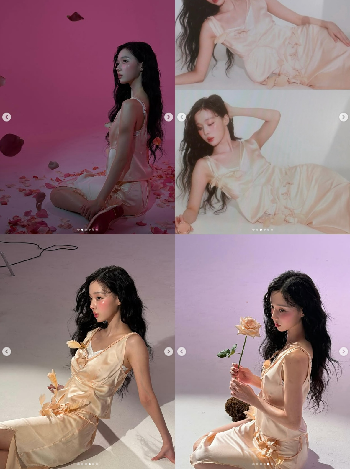 또한 윈터는 바닥에 누운 채 카메라를 응시하거나 장미꽃을 손에 들고 깊은 눈빛을 드러내며 한 편의 화보 같은 분위기를 완성했다. 윤기 나는 웨이브 헤어와 자연스러운 메이크업이 어우러지며 윈터 특유의 청초한 비주얼을 극대화했다.