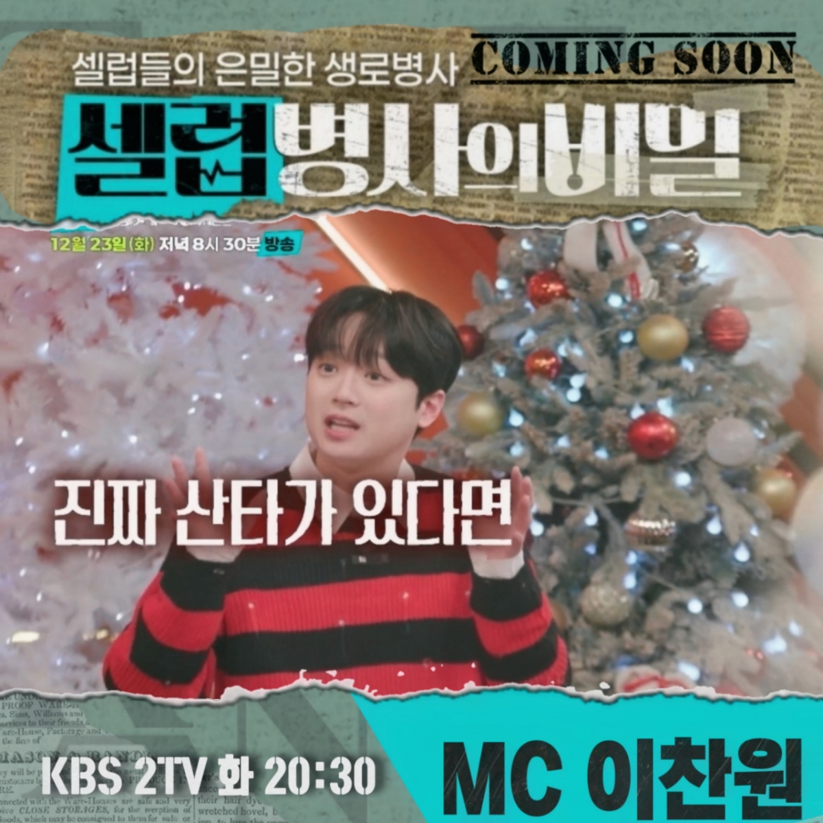 가수 이찬원이 크리스마스마다 찾아오는 하얀 수염의 사나이의 베일에 싸인 비밀을 파헤친다. 23일 방송하는 KBS 2TV '셀럽병사의 비밀'에서는 다 알지만 잘 몰랐던 산타클로스의 생로병사의 비밀이 집중 조명된다.
