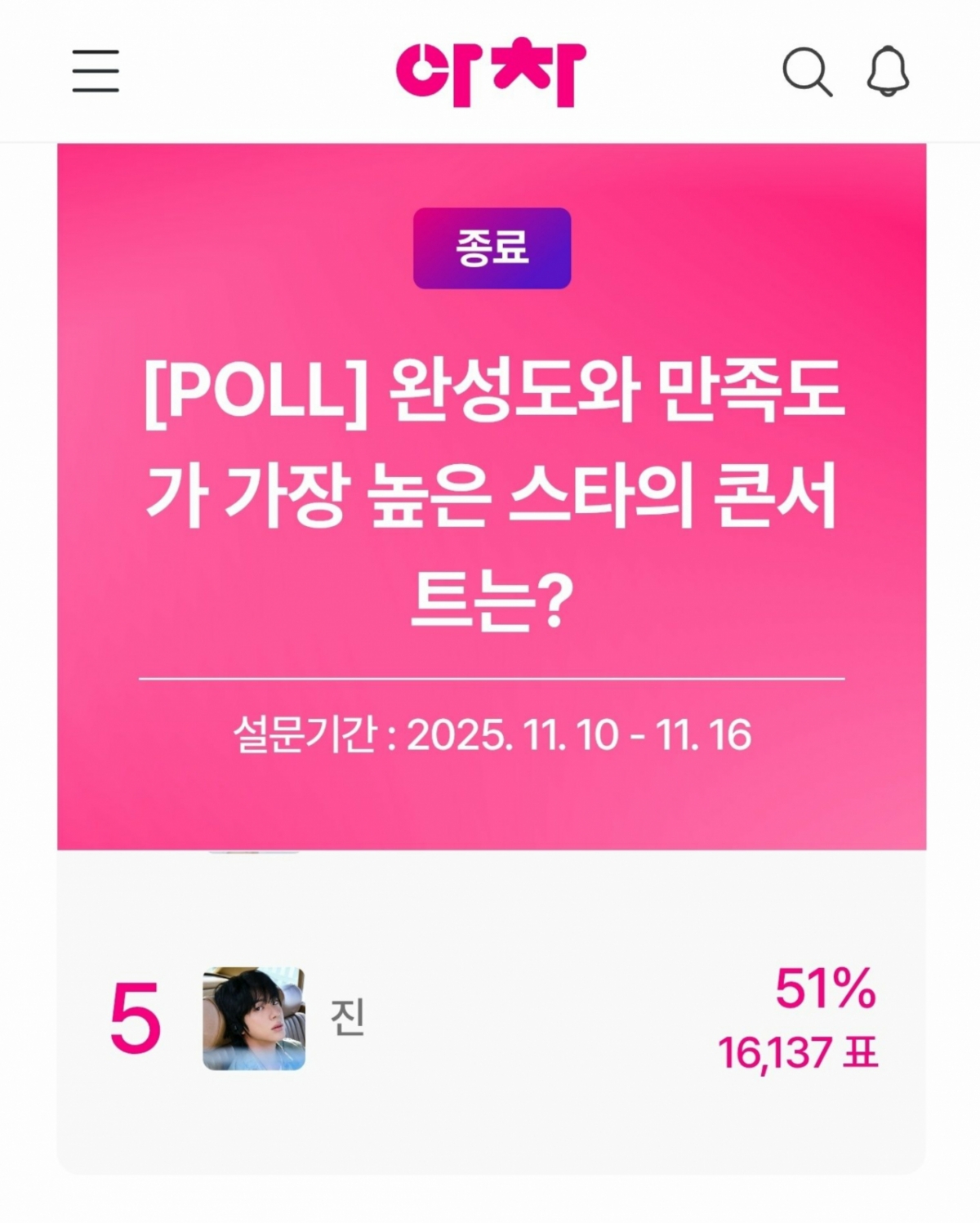 진은 아이돌 차트(Idol Chart)가 진행한 '완성도와 만족도가 가장 높은 스타의 콘서트는?' 설문 조사에서 51%의 압도적인 선택을 받으며 최종 1위에 이름을 올렸다. 이번 결과는 공연 전반의 구성력과 현장 몰입도가 얼마나 높은지를 직접적으로 보여주는 지표로 평가된다.