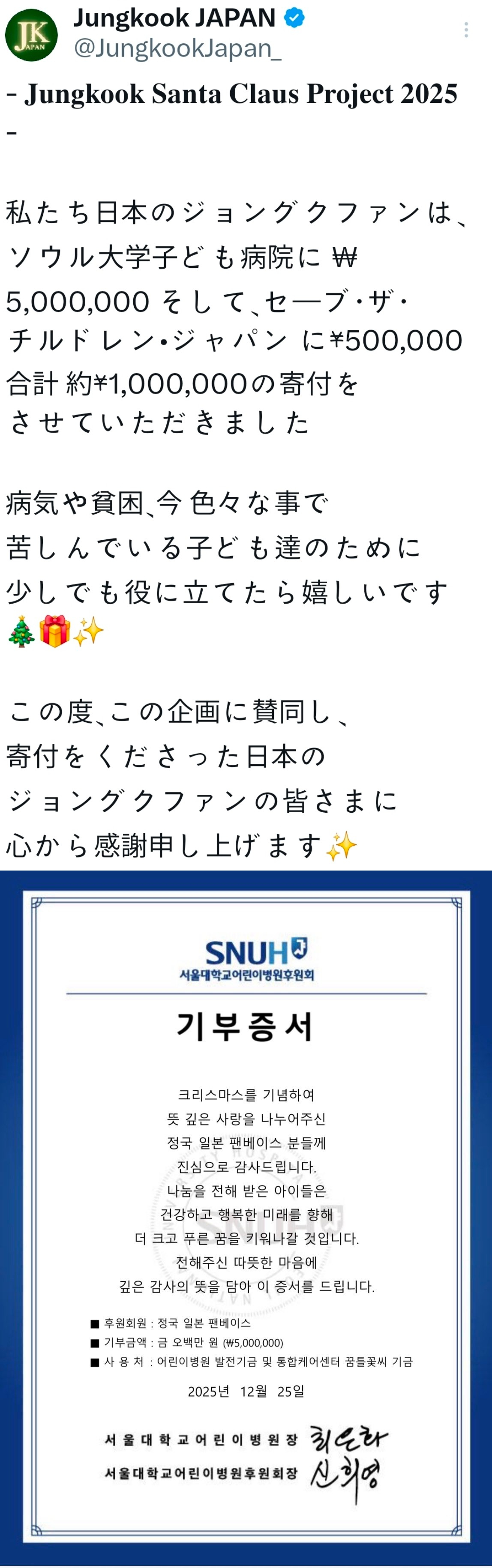 방탄소년단(BTS) 정국의 일본 팬클럽이 크리스마스를 맞아 따뜻한 기부 릴레이로 훈훈함을 자아냈다.정국의 일본 팬클럽 '정국 재팬'은 '2025 산타 클로스 프로젝트' 로 서울대어린이병원에 500만 원을 '정국 일본 팬베이스'로 기부했다.