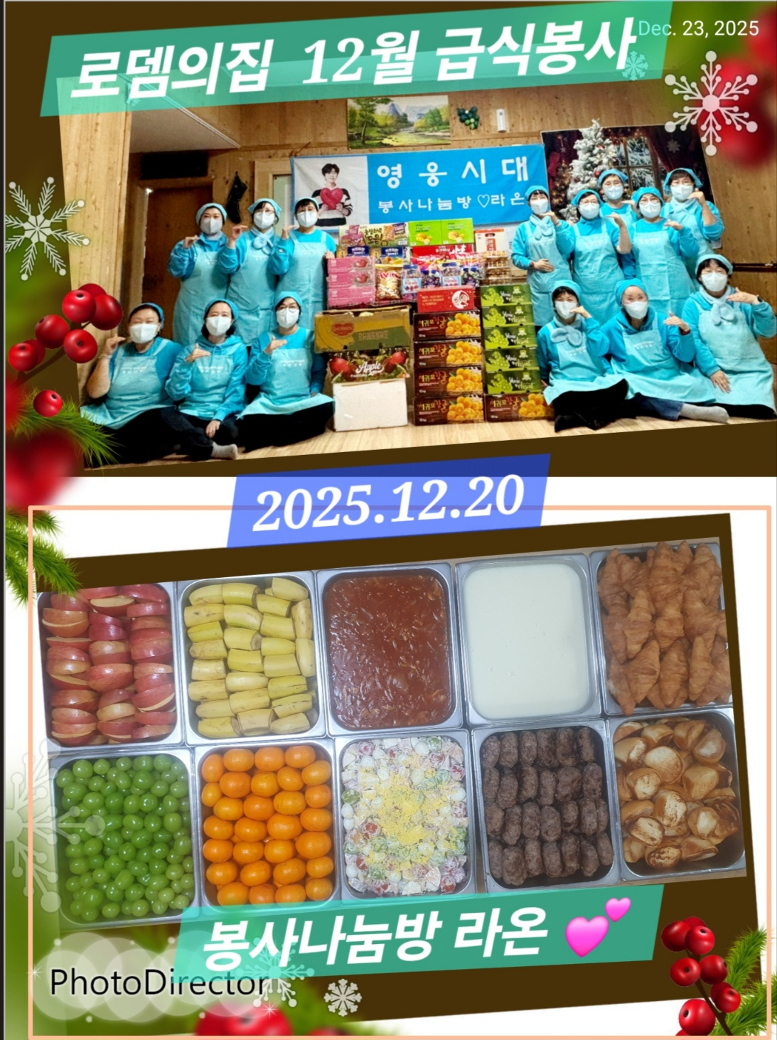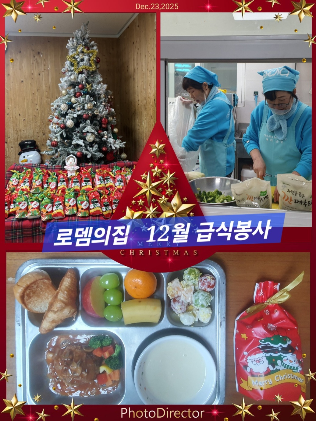 이달 급식은 성탄절을 맞아 특별 메뉴로 마련됐다. 함박스테이크, 크림수프, 빵, 과일샐러드 등을 직접 조리해 배식했고, 성탄 선물 키트와 여러 종류의 과일, 한우 양지 13kg을 제공했다. 급식 후원금은 221만원이다.