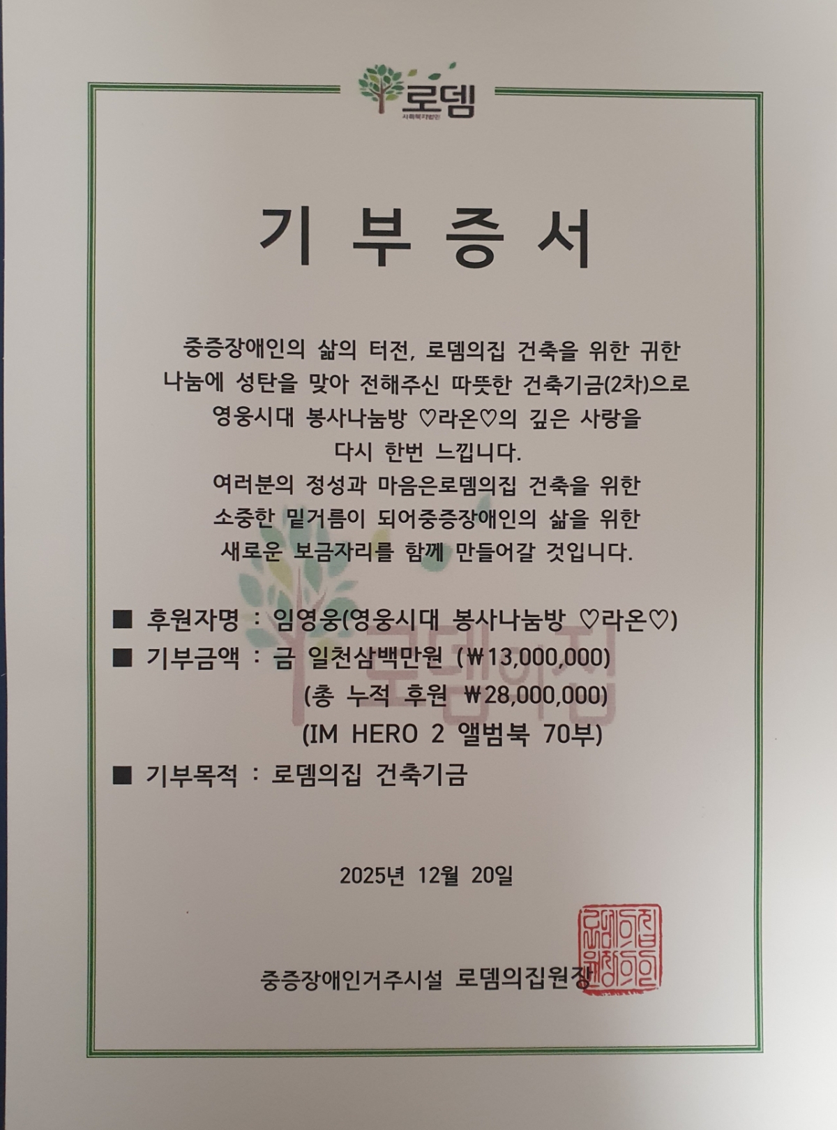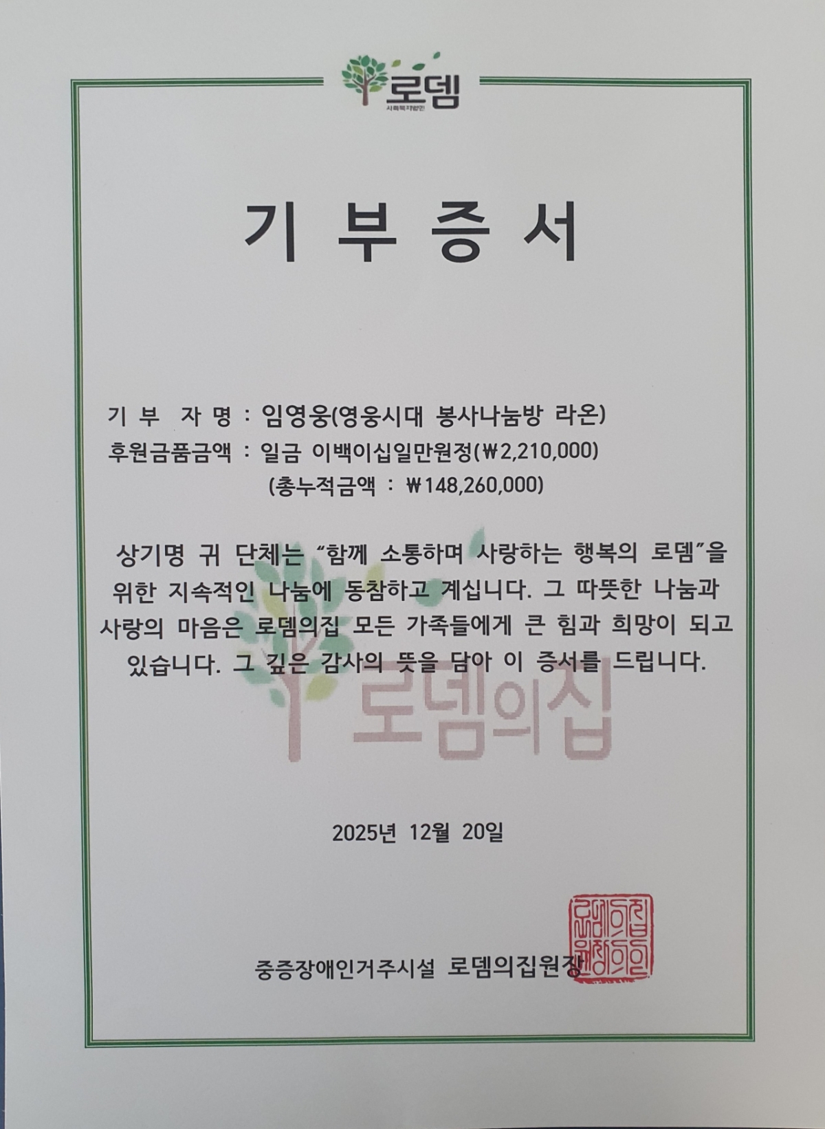 한편 '라온'은 이날 급식 봉사와 더불어 성탄절 특별기부도 진행했다. 재건축 기금이 부족해 공사를 시작하지 못했던 로뎀의집에 지난 웅탄일 1차로 1500만원을 후원했고, 이번 봉사일에 2차로 성탄절 특별기부금 1300만원을 전달했다.
