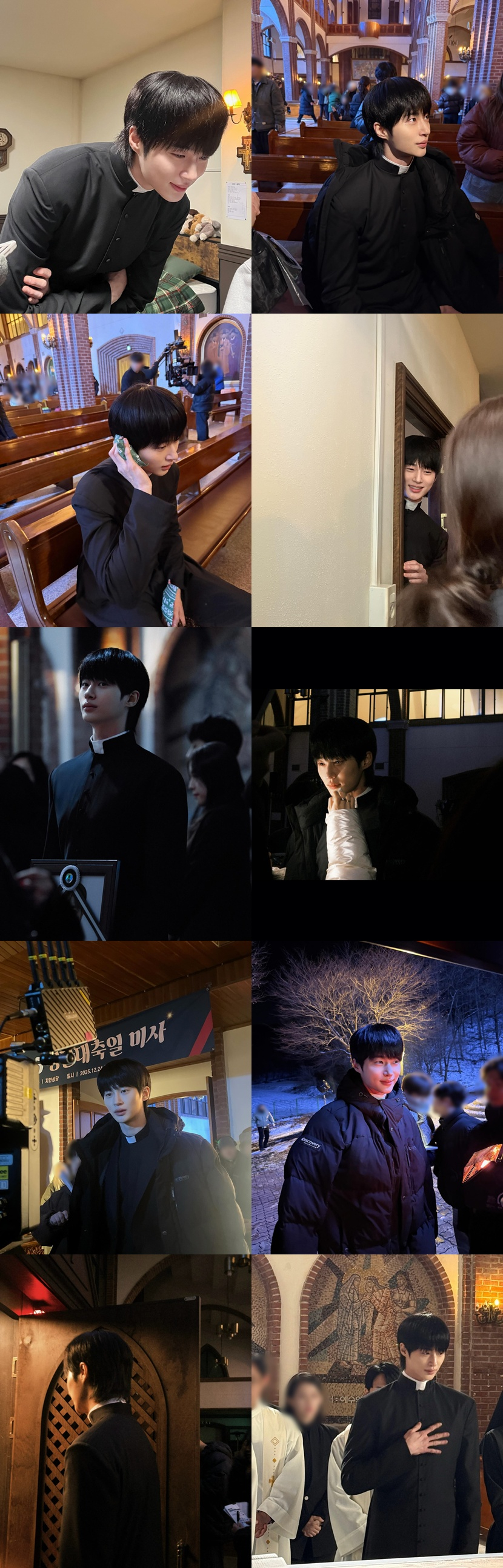 변우석은 성당을 배경으로 키 190cm의 신부복 핏을 자랑, 훈훈한 미소와 함께 열연한 모습을 전했다. 변우석은 새끼 강아지를 안고 이색적인 러블리 케미스트리를 보여주기도 했다.