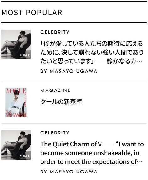 현재 '보그 재팬' 온라인 버전에서 가장 인기 있는 기사에 뷔의 인터뷰 기사 3개가 1위~3위까지 나란히 올라와 쏟아지는 관심을 입증하고 있다. 가장 많이 본 기사의 제목은 "내가 사랑하는 사람들의 기대에 부응하기 위해 결코 무너지지 않는 강한 사람이 되고 싶다. -조용한 카리스마, 뷔의 본모습"이다.