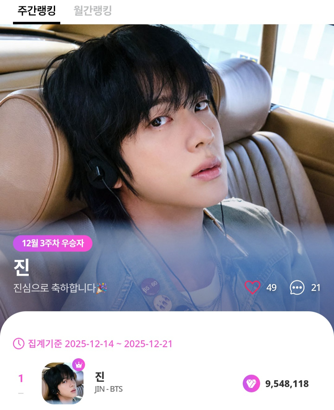 진은 마이원픽 12월 3주차(12월 14일~12월 21일) 'K-POP 개인 부문 주간랭킹'에서 954만 8118개의 하트를 획득하며 정상에 올랐다. 지난해 2월 5주차부터 시작된 연속 1위 기록은 95주째를 맞았으며, 이는 꾸준한 팬덤의 지지와 진의 영향력을 다시 한번 확인시켰다.
