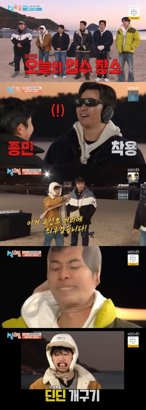 '1박 2일' 멤버들이 밤바다에서 올해 마지막 체력전을 펼쳤다. 28일 방송된 KBS 2TV 예능 프로그램 '1박 2일'에는 남해안을 따라 떠나는 '연말 고생 정산 레이스' 두 번째 이야기가 그려졌다.