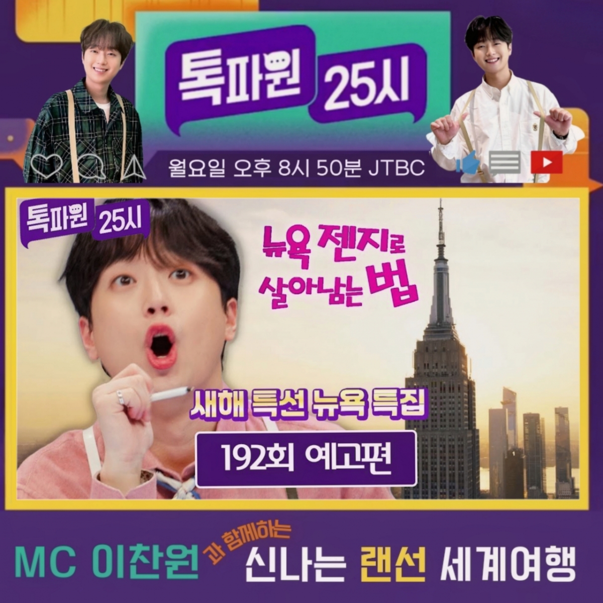 가수 이찬원이 새해맞이 일출부터 럭셔리 쇼와 도파민 충전을 동시에 즐길 수 있는 스릴 넘치는 랜선 여행의 세계로 시청자들을 초대한다.JTBC '톡파원 25시'는 12월 29일 방송을 통해 뉴욕 엠파이어 스테이트에서 맞이하는 일출, 젠지 유행어, 용화탑 지하 비밀 공간, 분수쇼와 럭셔리 호텔 수영, 상공 걷기 등 다양한 영상을 공개한다.