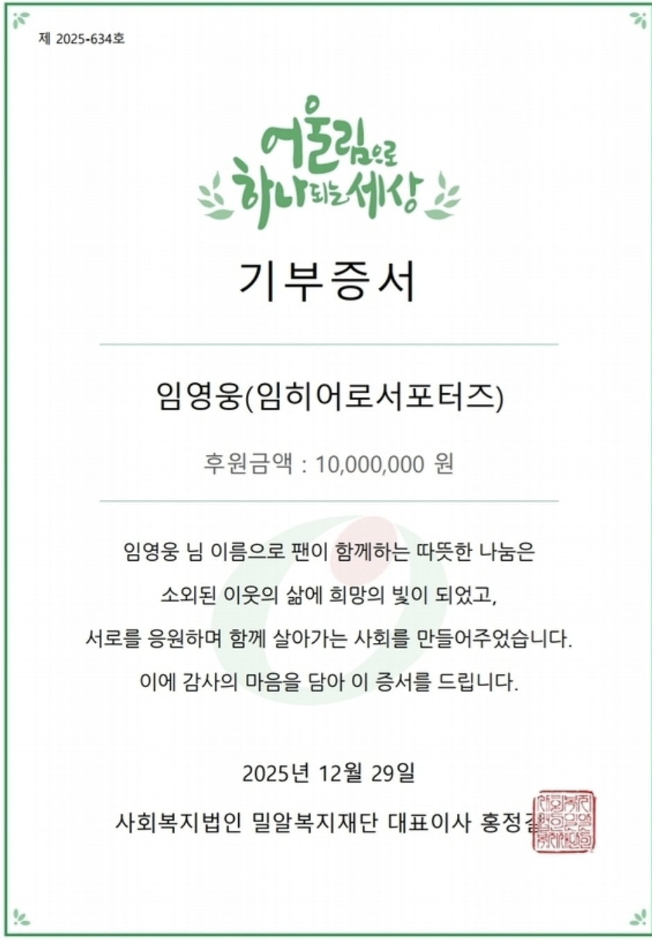 밀알복지재단 연보라 경기지부장은 "임히어로서포터즈의 꾸준한 나눔 실천은 장애아동과 가족들에게 큰 힘이 되고 있다"며 "소중한 후원이 치료가 시급한 아이에게 희망으로 전달될 수 있도록 책임 있게 사용하겠다"고 전했다.임히어로서포터즈 관계자는 "가수 임영웅을 사랑하는 팬들의 마음이 나눔으로 이어지길 바라는 뜻에서 2년째 기부를 이어오고 있다"며 "이번 후원이 장애아동에게 실질적인 도움이 되고 희망이 되기를 바란다"고 말했다.
