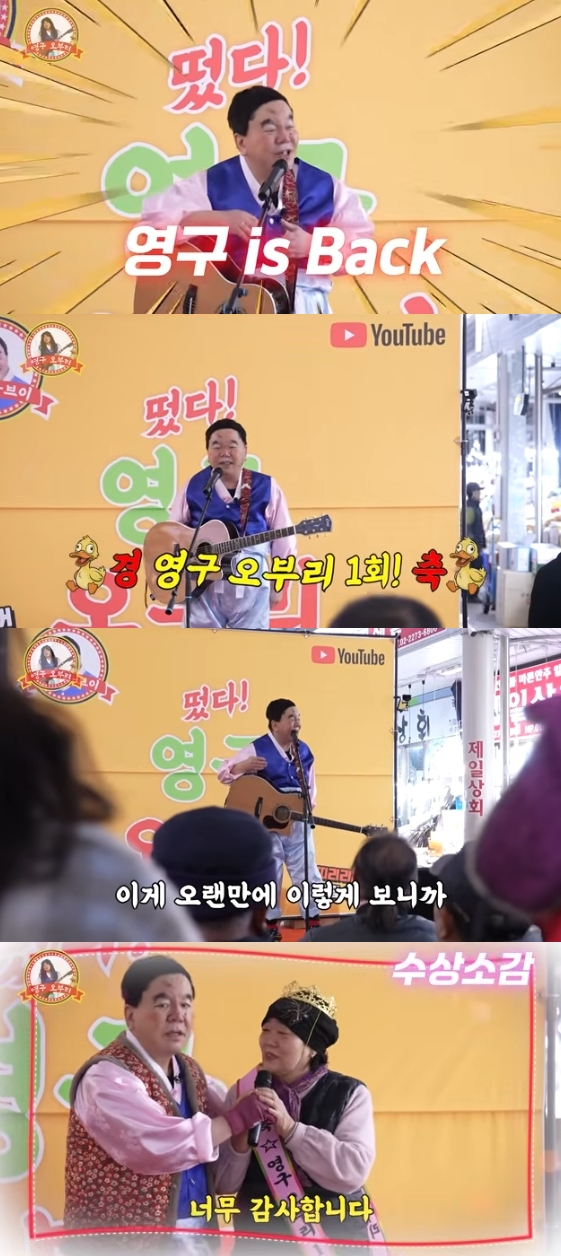공개된 영상에서 심형래는 전국의 시장을 돌며 상인들과 함께 노래하는 코너인 '영구 오부리'를 진행했다.