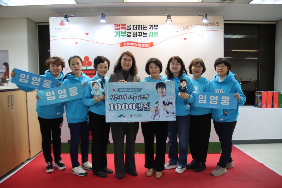 가수 임영웅의 팬클럽 '영웅시대 서울3구역방'이 한 해를 마무리하며 이웃 사랑을 실천했다. '영웅시대 서울3구역방' 정라일락 방장을 비롯한 82명의 회원은 모금한 기부금 1000만 원을 사회복지공동모금회 서울지회에 전달했다.