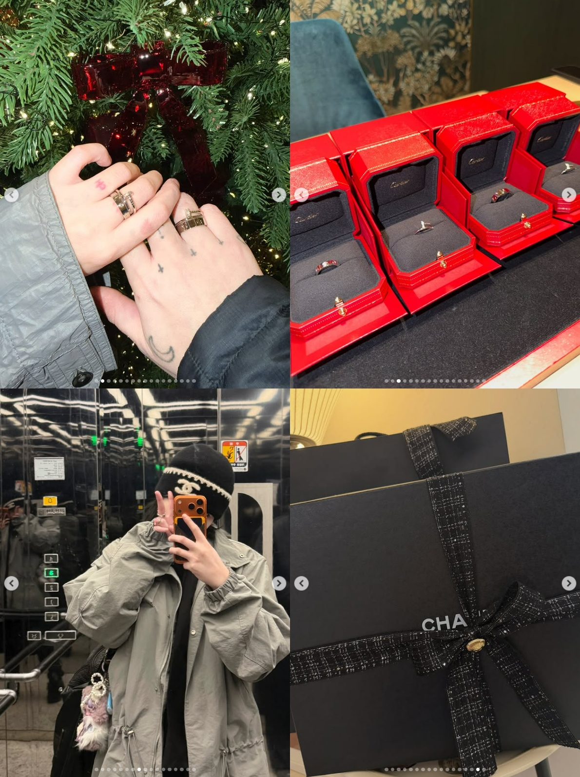 명품 자랑도 눈길을 끈다. 그는 용준형과 커플링으로 맞춘 C사 반지를 시작으로 C사 모자와 같은 브랜드의 케이스 사진을 연달아 업로드하며 폭풍 쇼핑 근황을 전했다.