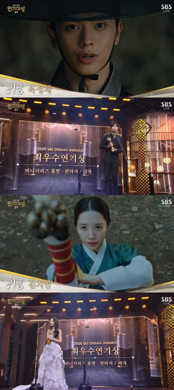 드라마 '귀궁'의 육성재와 김지연이 '2025 SBS 연기대상'에서 미니시리즈 휴먼·판타지 부문 최우수연기상을 수상했다. 31일 서울 마포구 SBS 프리즘타워에서 생방송으로 진행된 '2025 SBS 연기대상'은 신동엽, 채원빈, 허남준이 MC로 호흡을 맞춘 가운데 다양한 시상이 이어졌다.