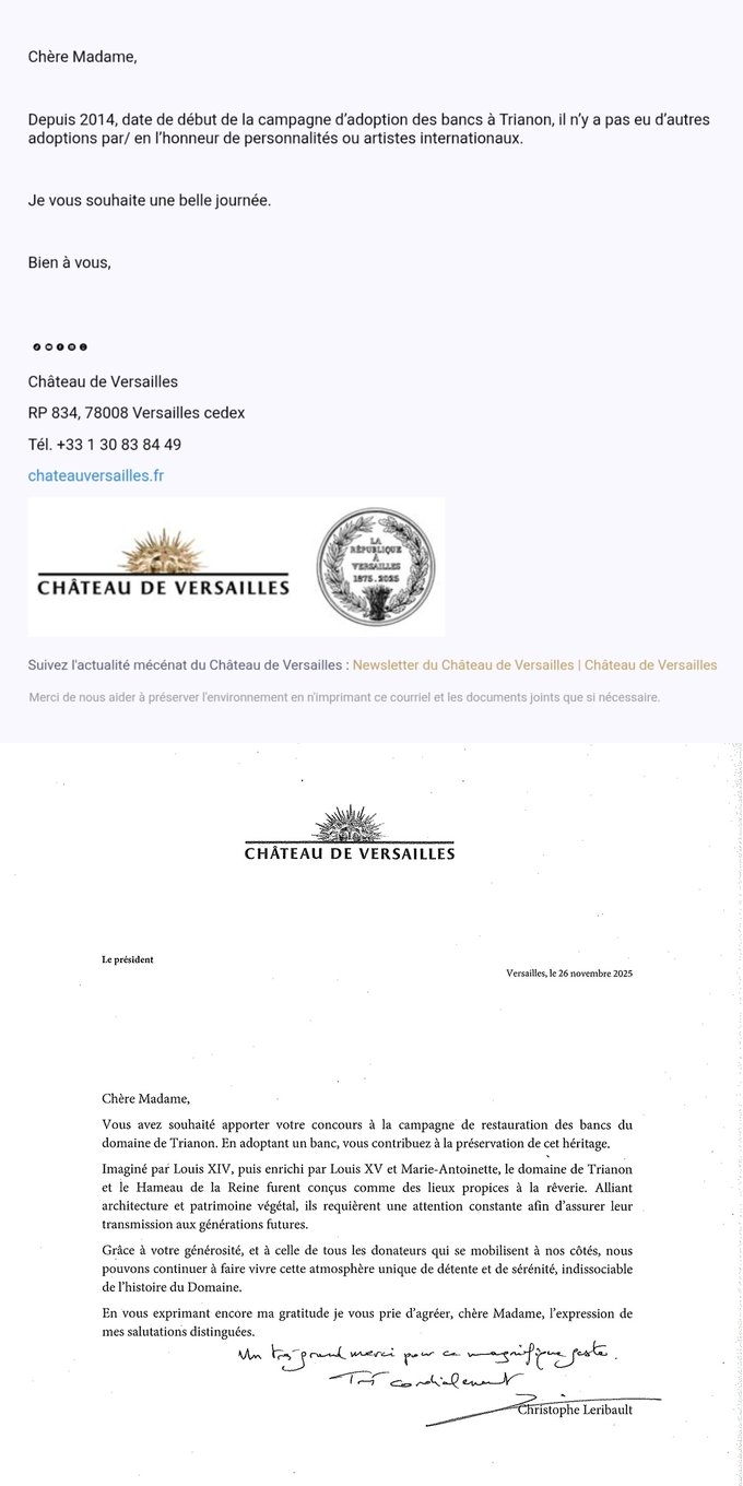 이번 헌정은 베르사유 궁전 공식 유산 후원 프로그램인 트리아농 벤치 입양(Adopt a bench in the Estate of Trianon)을 통해 이뤄졌다.
