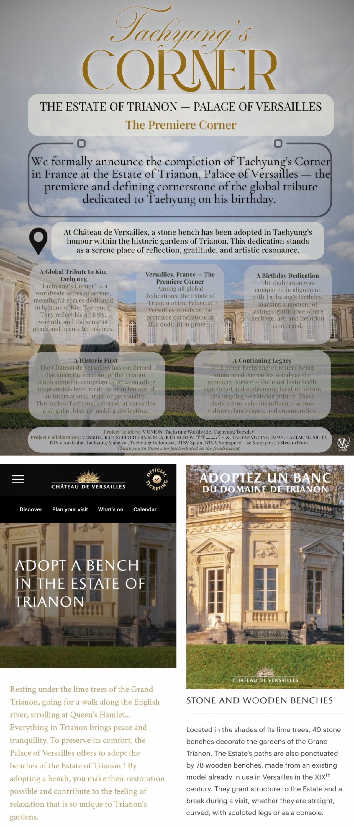 트리아농에는 40개의 돌 벤치와 78개의 나무 벤치가 정원 곳곳에 배치돼 있다. 이 중 뷔의 이름으로 돌 벤치가 입양됐다. 뷔의 이름 'KIM Taehyung'이 새겨진 작은 동판은 입양된 돌 벤치 옆 바닥에 설치된다. 이는 돌 벤치 보호를 위한 조치다.팬들은 뷔를 기념하는 장소로 파리 베르사유를 선택했다. 파리는 지난해 뷔가 전역 후 첫 공식 일정으로 패션쇼에 참석하며 새로운 활동을 시작한 곳이다. 또 베르사유는 군 복무 중 공개된 '윈터 어헤드' 뮤직비디오 촬영지로 의미가 있다. 팬들은 이 같은 배경에서 파리의 베르사유 궁전 트리아농에 뷔의 생일을 기념하는 공간을 마련했다고 전했다.