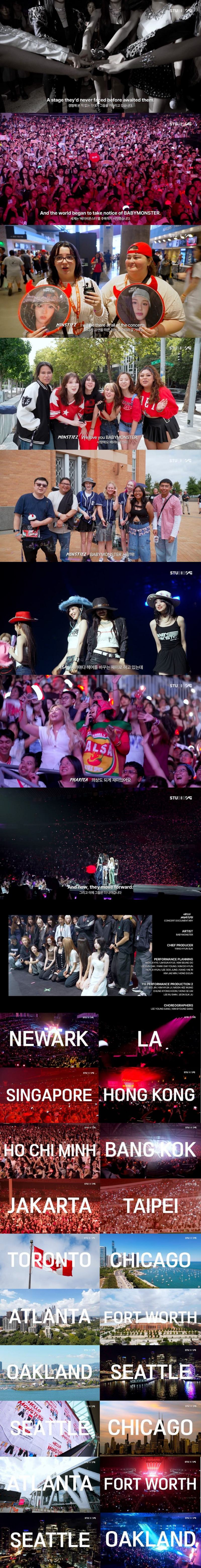 베이비몬스터는 지난해 1월부터 약 8개월간 총 20개 도시·32회차에 달하는 데뷔 첫 월드투어를 전개하며 30만 명의 관객과 교감했다. 이날 공개된 영상에는 토론토, 로즈몬트, 애틀랜타, 포트워스, 오클랜드, 시애틀까지 총 6개 도시·6회차 북미 투어의 여정이 펼쳐졌다.