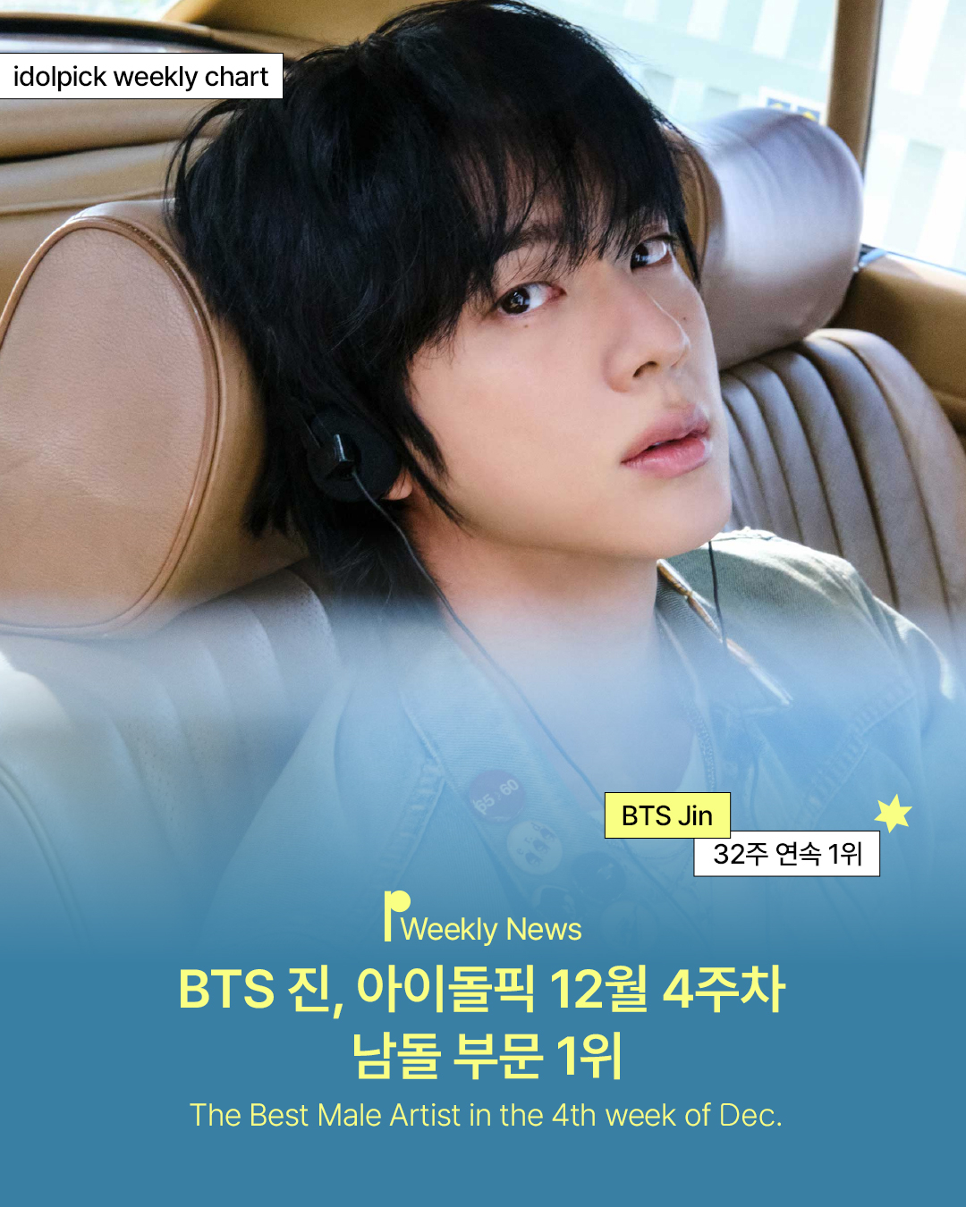 진은 아이돌픽 2025년 12월 4주차(12월 22일~28일) 위클리 투표 '남자 아이돌 개인 부문'에서 5만 728픽을 획득하며 1위에 올랐다. 진은 32주 연속 1위를 기록하며 꾸준한 인기를 다시 한번 입증했다.
