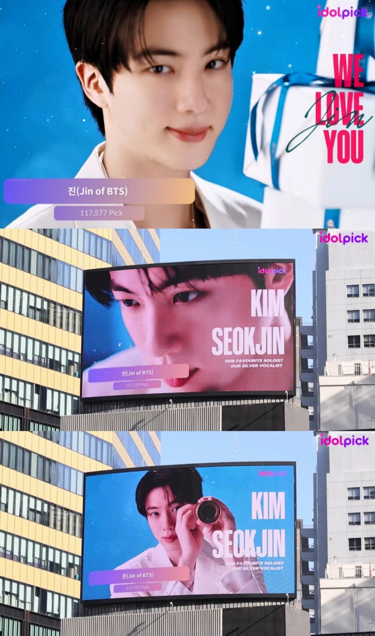 앞서 지난 2주간(12월 8일~21일) 진행된 누적 투표에서도 진은 총 11만 7577픽을 얻어 전광판 리워드 대상 가운데 최다 득표로 1위를 차지했다. 해당 리워드 광고는 1월 2일부터 4일까지 서울 중구 롯데에비뉴엘 맞은편 초대형 전광판을 통해 송출되고 있다. 이 같은 성과는 팬 참여로 진행되는 투표에서 장기간 이어졌다는 점에서 진의 변함없는 영향력과 두터운 팬덤의 저력을 보여준다.