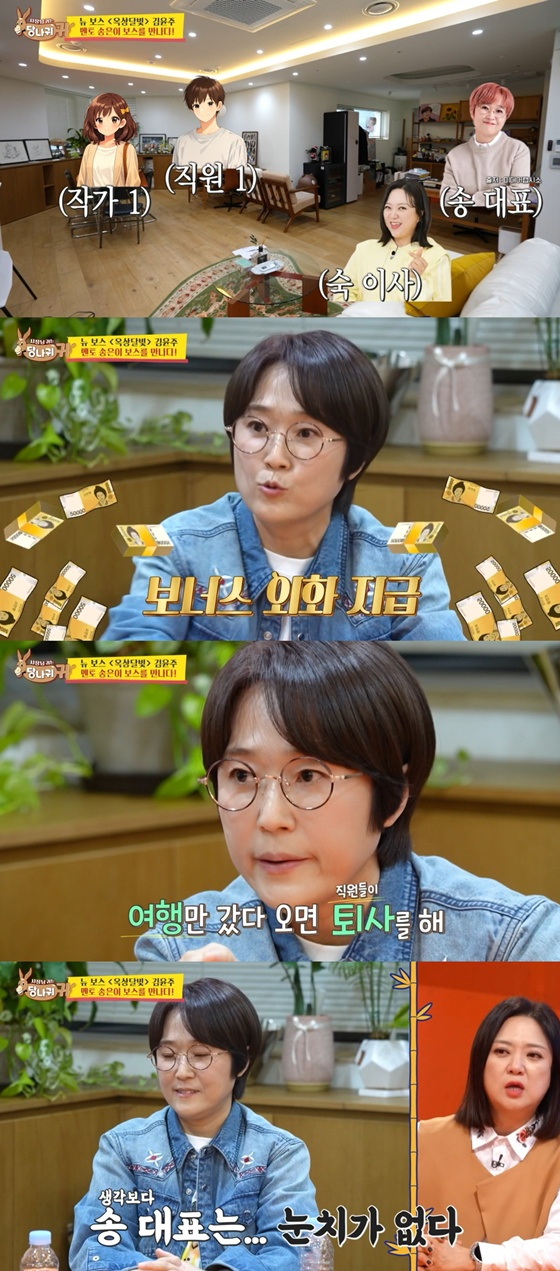 방송인 송은이가 빵빵한 복지에도 직원들이 퇴사한다고 고민을 털어놨다. 지난 4일 방송된 KBS 2TV 예능프로그램 '사장님 귀는 당나귀 귀'에서는 올해 11년 차 연예기획사 CEO 송은이의 회사를 찾아간 김윤주의 모습이 그려졌다.