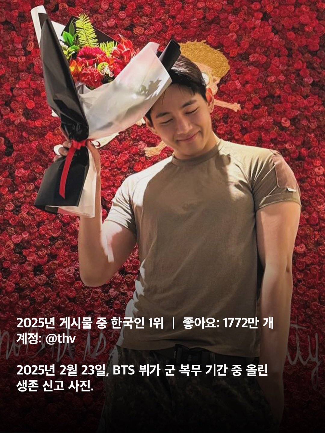 한국 셀럽 게시물 중 최다 '좋아요'를 받은 게시물은 뷔가 지난해 2월 23일 군 복무 중 근황을 알린 사진이다. 현재 이 게시물은 1773만 '좋아요'와 공유 184.3만개를 기록하고 있다.