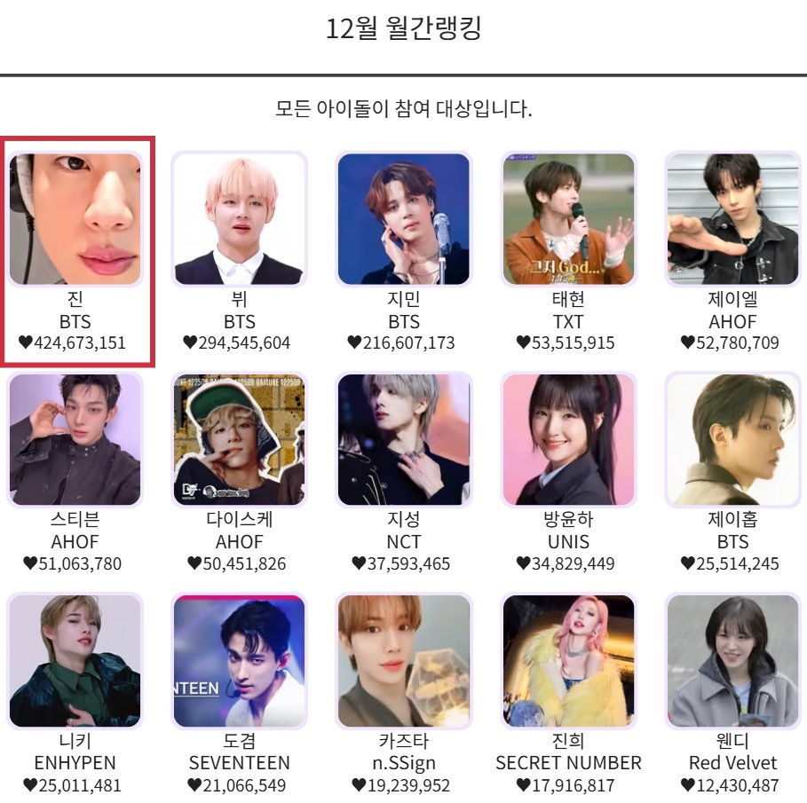 앞서 진은 11월 월간랭킹에서도 1위를 기록했다. 두 달 연속 정상에 오르며 흔들림 없는 인기 흐름을 이어가고 있는 가운데, 11월 월간랭킹 1위에 따른 리워드 광고는 오는 1월 17일까지 서울 강남역과 압구정역에서 만나볼 수 있다.