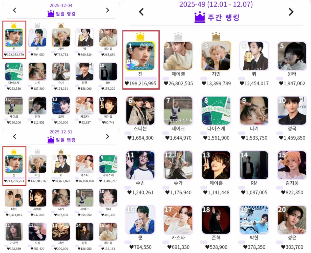 진은 지난해 생일이었던 12월 4일 하루 동안 1억 9207만 2379표를 기록하며 일일랭킹 1위에 올랐고, 같은 기간(12월 1일~7일) 집계된 주간랭킹에서도 1억 9821만 6995표를 얻어 정상을 차지했다. 이어 월간 집계 마감일인 12월 31일에는 2억 1320만 5263표를 획득하며 12월 월간랭킹 1위 확정에 결정적인 힘을 보탰다.