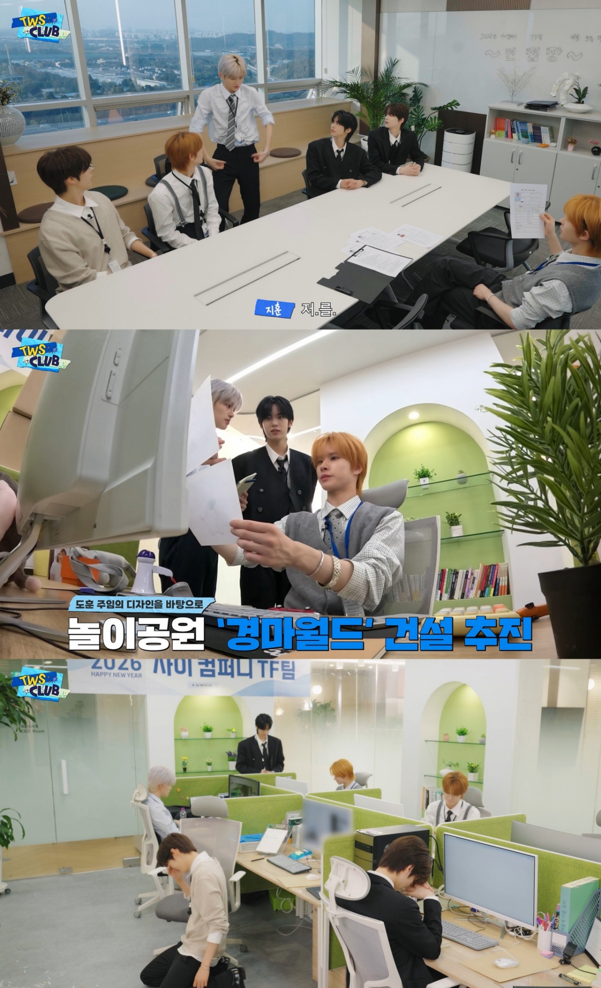 그룹 TWS(투어스)가 오피스 예능을 통해 업그레이드된 예능감을 뽐냈다.TWS(신유, 도훈, 영재, 한진, 지훈, 경민)는 지난 6일 팀 공식 유튜브 및 글로벌 슈퍼팬 플랫폼 위버스(Weverse) 채널에 'TWS:CLUB' 44화를 공했다. '사이 컴퍼니' TF팀에 지원한 평사원 멤버들과 면접관으로 나선 경민 부장의 '대환장 케미스트리'가 담긴 영상이다.