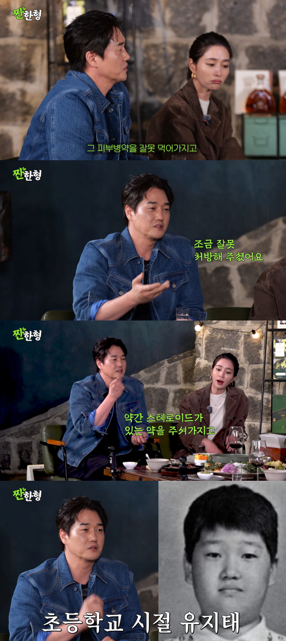 유지태는 "그렇다. 어릴 때 피부병약을 잘못 먹었다. 의사 선생님이 좀 잘못 처방해 줬다"고 밝혔다.그는 "스테로이드가 있는 약을 줘서 정말 엄청 먹었다"며 "그 약 먹고 나서 정말 비대해졌다. 65kg까지 쪘다"고 털어놨다.