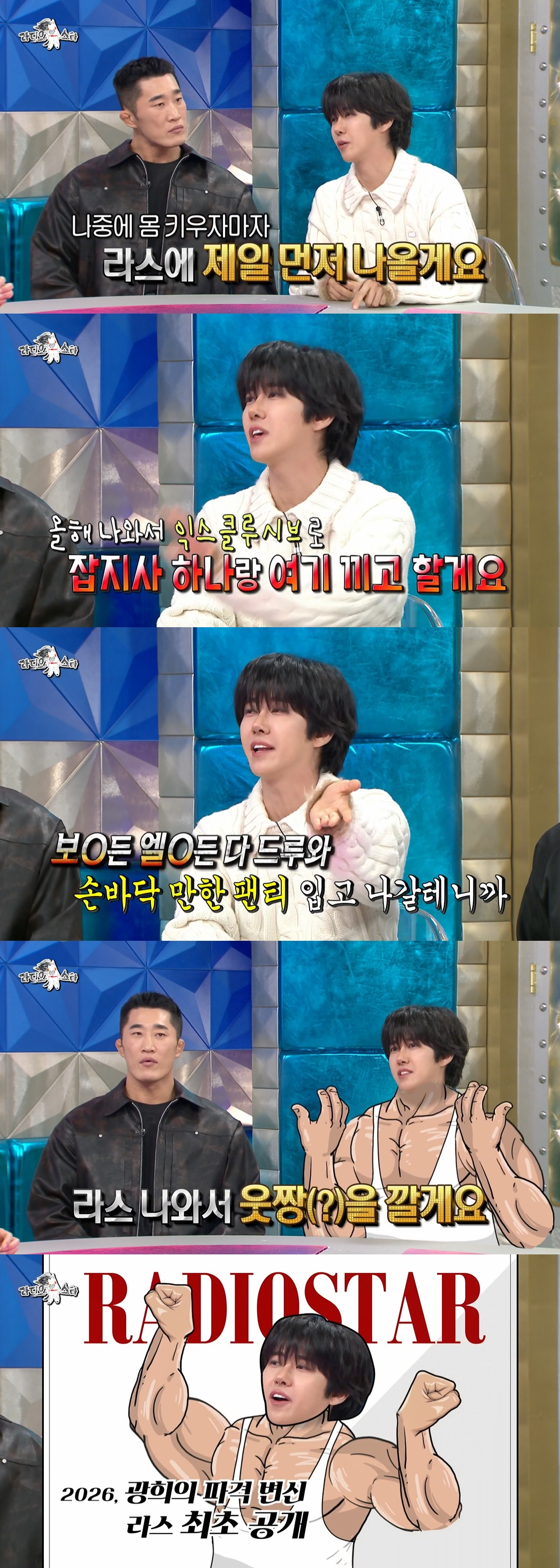 심지어 파격 공약도 내세웠다. "나중에 몸 키우자마자 '라스'에 제일 먼저 나오겠다"는 광희는 "목표는 올해 안이다. 올해 나와서 익스클루시브로 잡지사 하나랑 '라스' 끼고 하겠다. 손바닥만한 팬티 입고 나가겠다. '라스' 나와서 상의 탈의하겠다"라고 전했다.