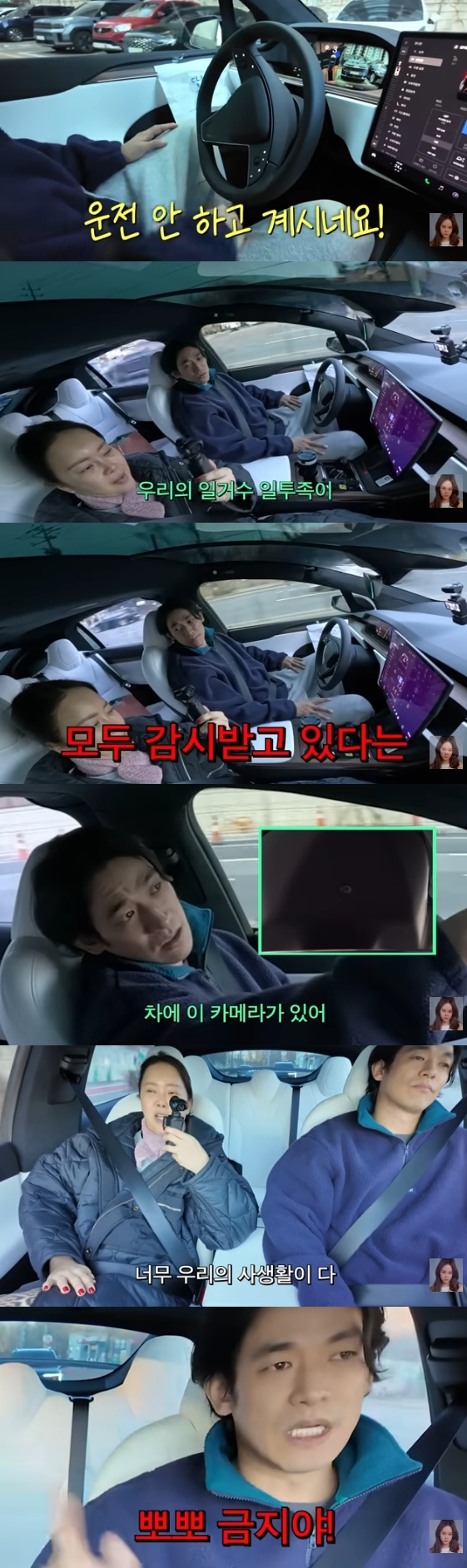 그는 "차에 카메라가 있다. 우리가 만약에 운전할 때 불필요한 동작을 하면 경고음이 발생한다"라고 설명했다.