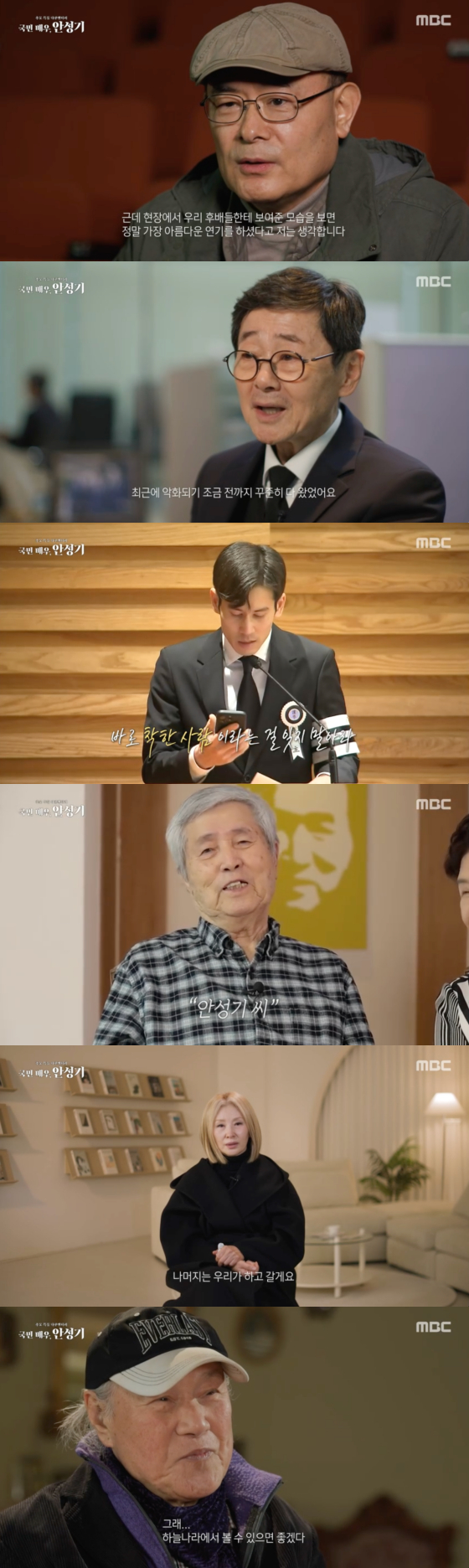 배우 고(故) 안성기가 혈액암 투병 중 촬영한 영화 '한산' 비화가 공개됐다.11일 오후 방송된 MBC 추모 특집 다큐멘터리 '국민배우, 안성기'에는 한국 영화의 역사이자 시대의 얼굴로 살아온 안성기의 삶과 그가 남기고 간 마지막 흔적이 담겼다.