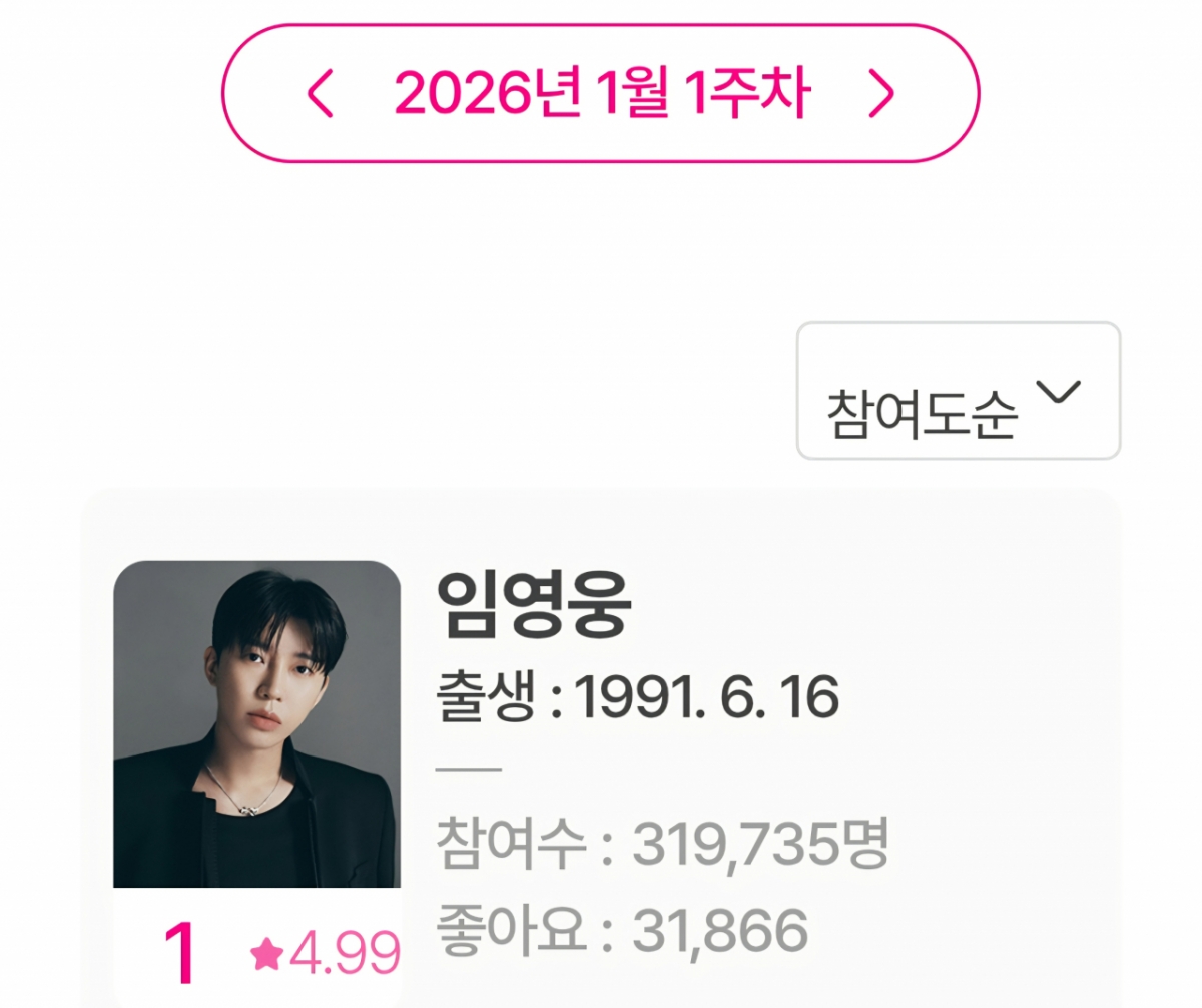 임영웅은 1월 5일부터 1월 11일까지 집계된 1월 1주차 아이돌차트 평점랭킹에서 31만 9735표를 얻어 최다득표를 기록했다.