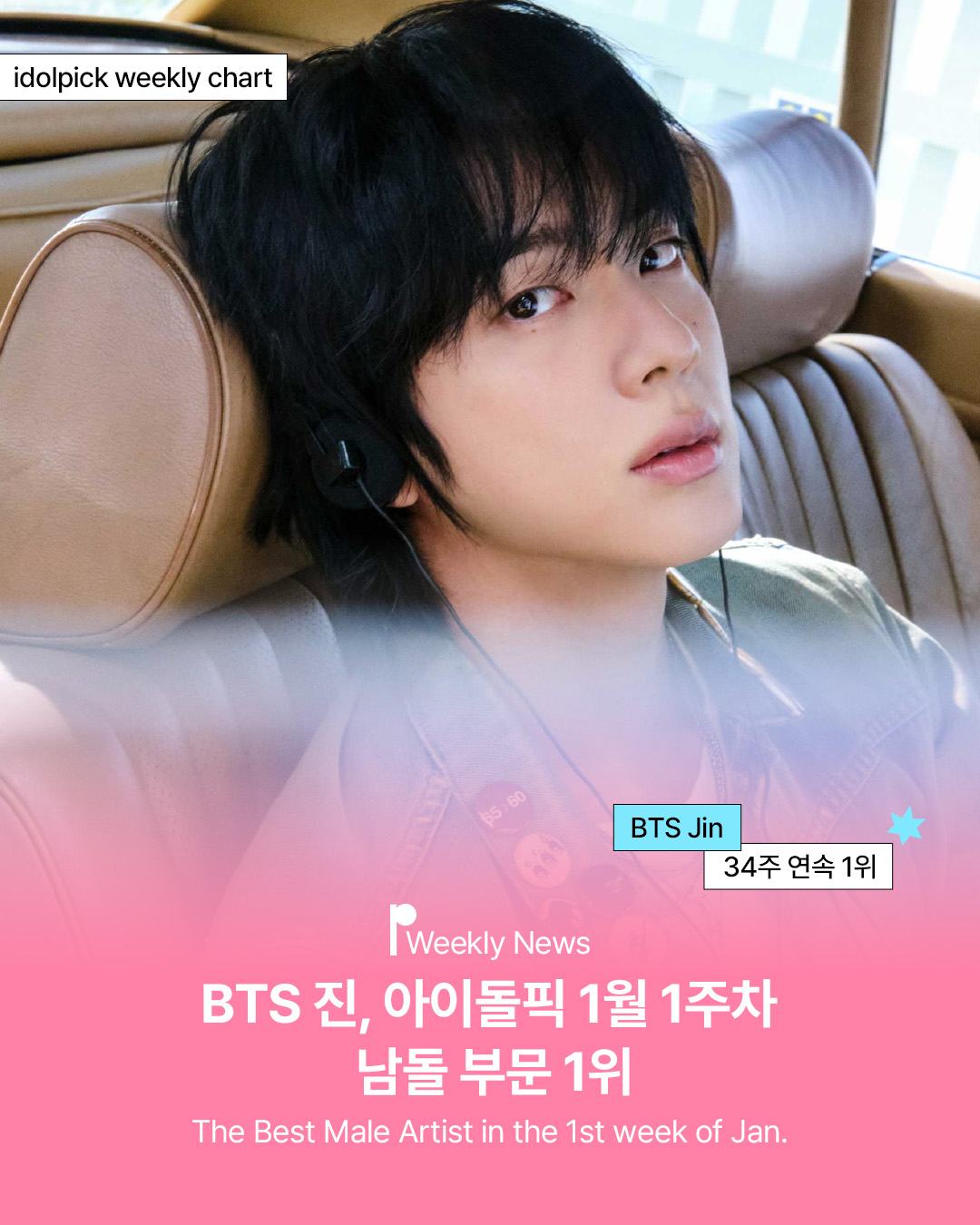 진은 아이돌픽(idolpick) 1월 1주차(1월 5일~11일) 남자 아이돌 부문에서 5만 1574픽을 획득하며 1위에 올랐다. 이로써 진은 해당 부문에서 34주 연속 정상을 지키며 롱런 행진을 이어갔다.