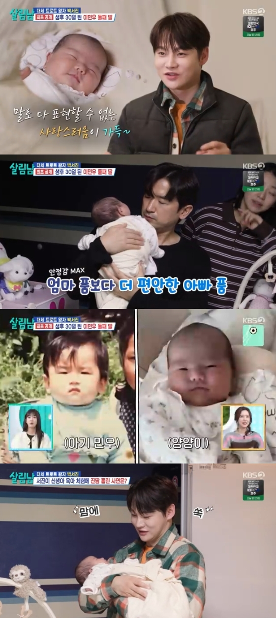 가수 이민우가 생후 한 달 된 둘째 딸을 최초 공개했다. 17일 방송된 KBS 2TV 예능 프로그램 '살림하는 남자들 시즌2'에는 이민우의 둘째 딸 '양양이'를 만나러 간 박서진의 모습이 그려졌다.