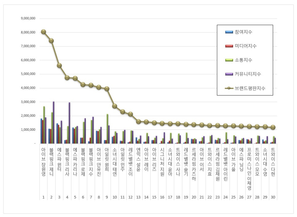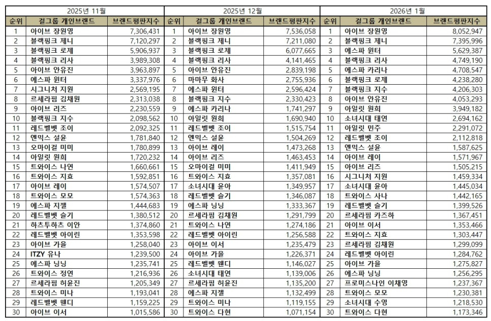 2026년 1월 걸그룹 개인 브랜드평판 30위 순위는 아이브 장원영, 블랙핑크 제니, 에스파 윈터, 블랙핑크 리사, 에스파 카리나, 블랙핑크 로제, 블랙핑크 지수, 아이브 안유진, 아일릿 원희, 소녀시대 태연, 아일릿 민주, 레드벨벳 조이, 엔믹스 설윤, 아이브 레이, 아이브 리즈, 시그니처 지원, 소녀시대 윤아, 트와이스 사나, 레드벨벳 슬기, 르세라핌 카즈하, 아이브 이서, 트와이스 지효, 르세라핌 김채원, 레드벨벳 아이린, 아이브 가을, 에스파 닝닝, 프로미스나인 이채영, 트와이스 모모, 소녀시대 수영, 트와이스 다현 순으로 분석됐다.