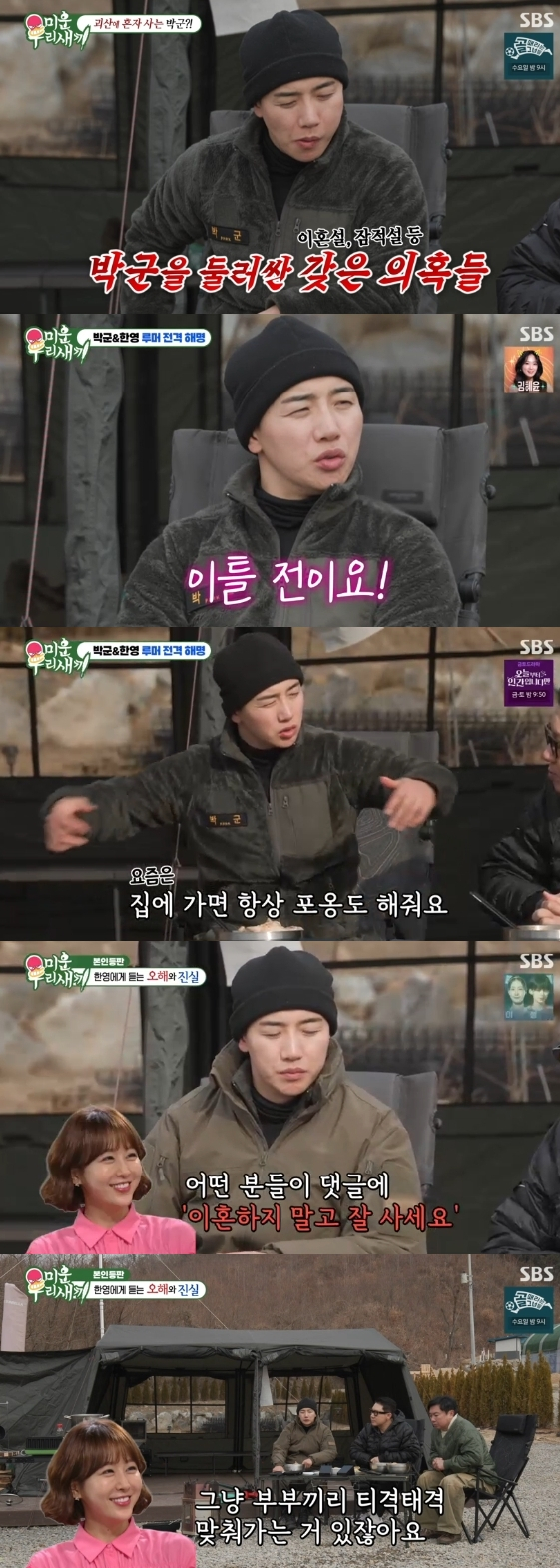 가수 박군이 아내 한영과의 이혼설에 대해 입을 열었다. 18일 방송된 SBS 예능 프로그램 '미운 우리 새끼'에는 충북 괴산에서 홀로 텐트 생활을 하고 있는 박군의 모습이 그려졌다.