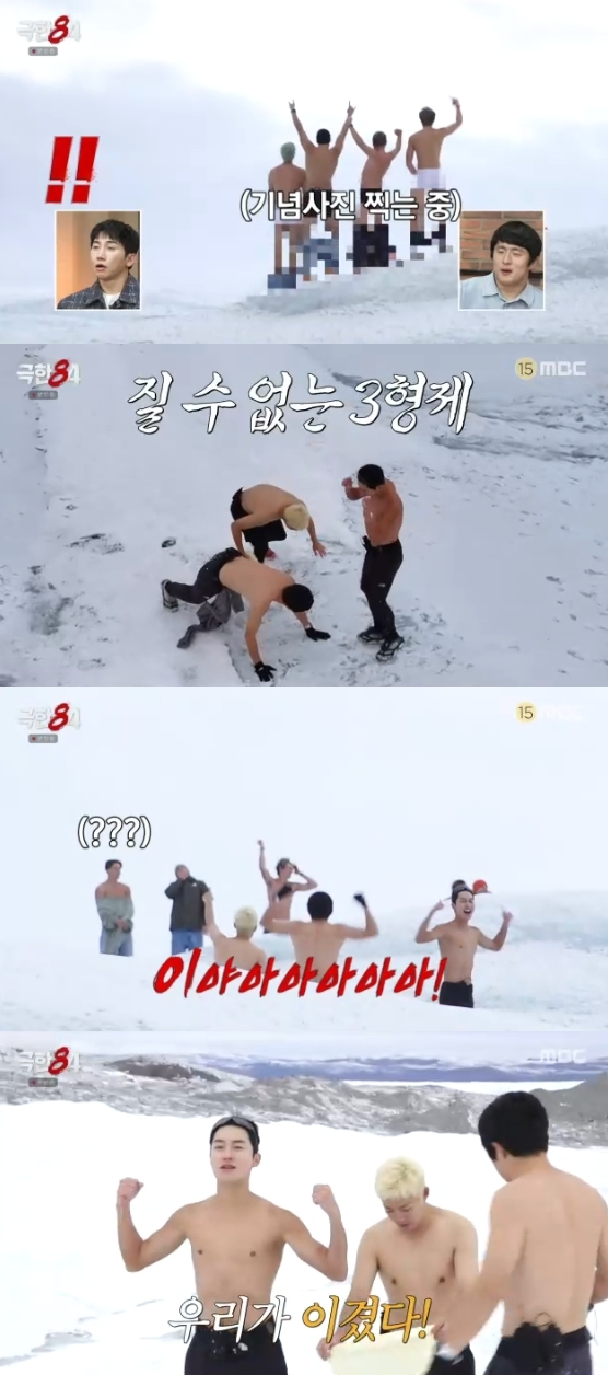 이에 질세라 극한크루 또한 눈밭에 엎드렸으나 추위를 이기지 못하고 곧바로 일어나 웃음을 자아냈다.