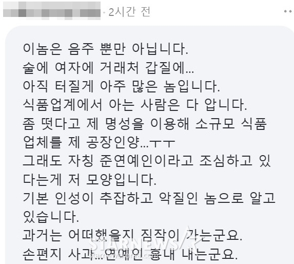 작성자 A 씨는 "이X은 음주뿐만이 아니다. 술에, 여자에, 거래처 갑질에, 아직 터질 게 아주 많은 X이다. 식품업계에서 아는 사람은 다 안다"라는 주장을 펼쳤다.