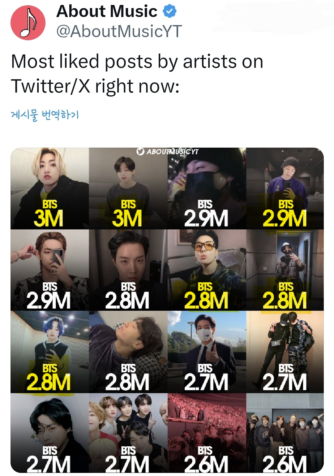 방탄소년단(BTS) 정국이 소셜미디어에서 가장 많은 좋아요를 받은 아티스트 1, 2위를 모두 차지하며 글로벌 초대세 아이콘의 위엄을 입증했다.전 세계 음악 전문 소식을 전하는 '어바웃 뮤직'(About Music) 공식 계정은 최근 소셜미디어 'X'(엑스, 구 트위터)에서 가장 많은 좋아요를 얻은 아티스트 게시물을 집중 조명해 전했다.