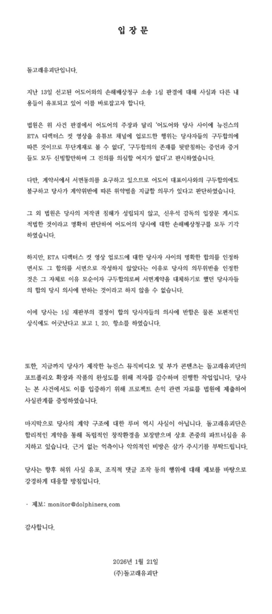 영상제작사 돌고래유괴단이 그룹 뉴진스 소속사 어도어와의 손해배상청구 소송 1심 판결에 대한 입장을 밝혔다.돌고래유괴단은 21일 입장문을 내고 "법원은 사건 판결에서 어도어의 주장과 달리 '어도어와 당사 사이에 뉴진스의 'ETA' 디렉터스 컷 영상을 유튜브 채널에 업로드한 행위는 당사자들의 구두합의에 따른 것이므로 무단게재로 볼 수 없다', '구두합의의 존재를 뒷받침하는 증언과 증거들도 모두 신빙할만하며 그 진의를 의심할 여지가 없다'고 판시했다. 다만 다만 계약서에서 서면 동의를 요구하고 있으므로 어도어 대표이사와의 구두합의에도 불구하고 당사가 계약위반에 따른 위약벌을 지급할 의무가 있다고 판단했다"고 밝혔다.