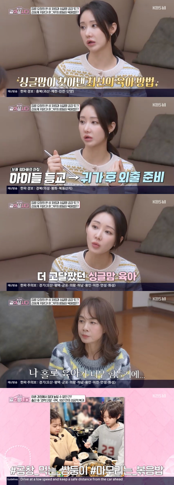 배우 한그루가 이혼 후 쌍둥이 남매를 홀로 양육하는 근황을 전했다.21일 오후 방송된 KBS 1TV 예능 프로그램 '황신혜의 같이 삽시다'에는 황신혜, 장윤정, 정가은이 한그루와 만나는 모습이 그려졌다.